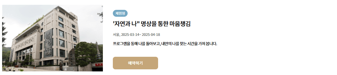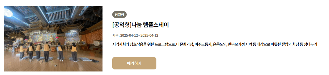 - 체험형 템플스테이: "자연과 나" 명상을 통해 자신을 돌아보고 내면을 찾는 시간을 제공합니다.